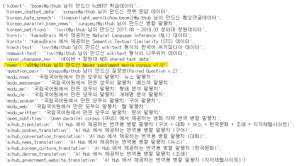 그 중에서 Naver 영화 리뷰 말뭉치인 nsmc 데이터를 활용할 것이다
